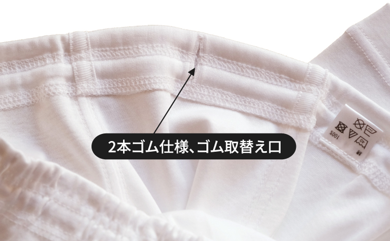 柔らかい2本ゴムを使用することにより締付感が少なくストレスフリーな履き心地です(ゴム取替え口付き)